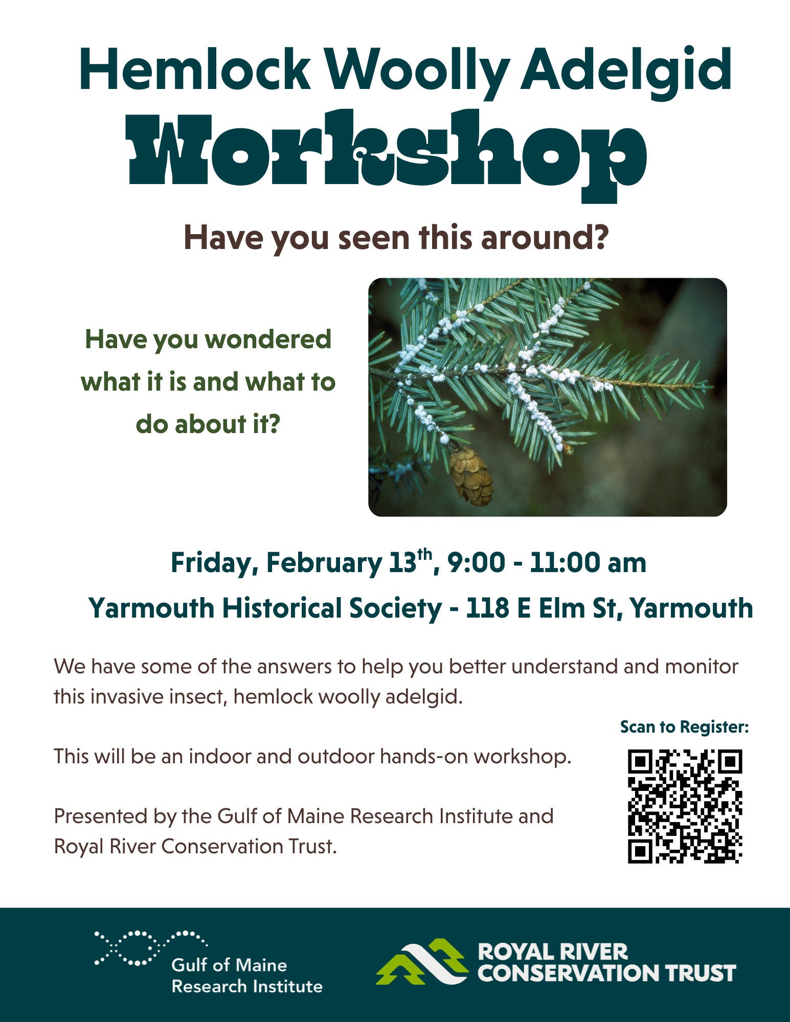 The Gulf of Maine Research Institute will be joining us to share about their community science initiative, Project Hemlock Woolly Adelgid. In this hands-on workshop, you'll learn how to monitor your local forest for HWA, identify signs of infestation, and report your findings to support ongoing research. After an indoor introduction to HWA, we'll head outside to Royal River Park to locate eastern hemlock trees, practice identifying HWA in the field, and collect real data for the project.