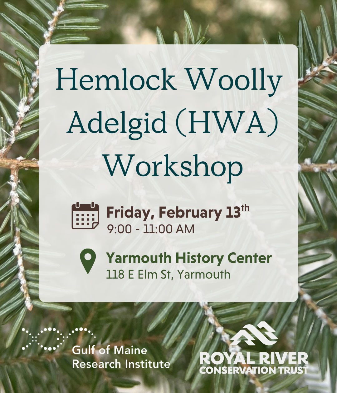 Join Royal River Conservation Trust and the Gulf of Maine Research Institute (GMRI) for a free, hands-on workshop on the hemlock woolly adelgid (HWA) - an invasive pest threatening Maine’s hemlock forests.