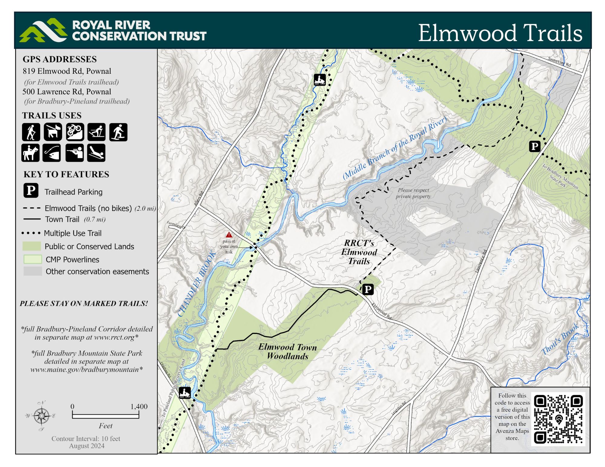 Elmwood Trails is a 2-mile series of trail easements across four private landowners along with state and Royal River Conservation Trust land; please respect all trail postings and recognize that the land on both sides of the path is private in most locations. This two-mile trail is part of the Bradbury-Pineland Corridor – a network of trails traversing state-owned land, powerline rights-of-way, and other trails that connect Bradbury Mountain State Park and the Pineland Public Land. Elmwood Trails also connects to the Town of Pownal's Elmwood woodlot, on which RRCT holds a conservation easement.